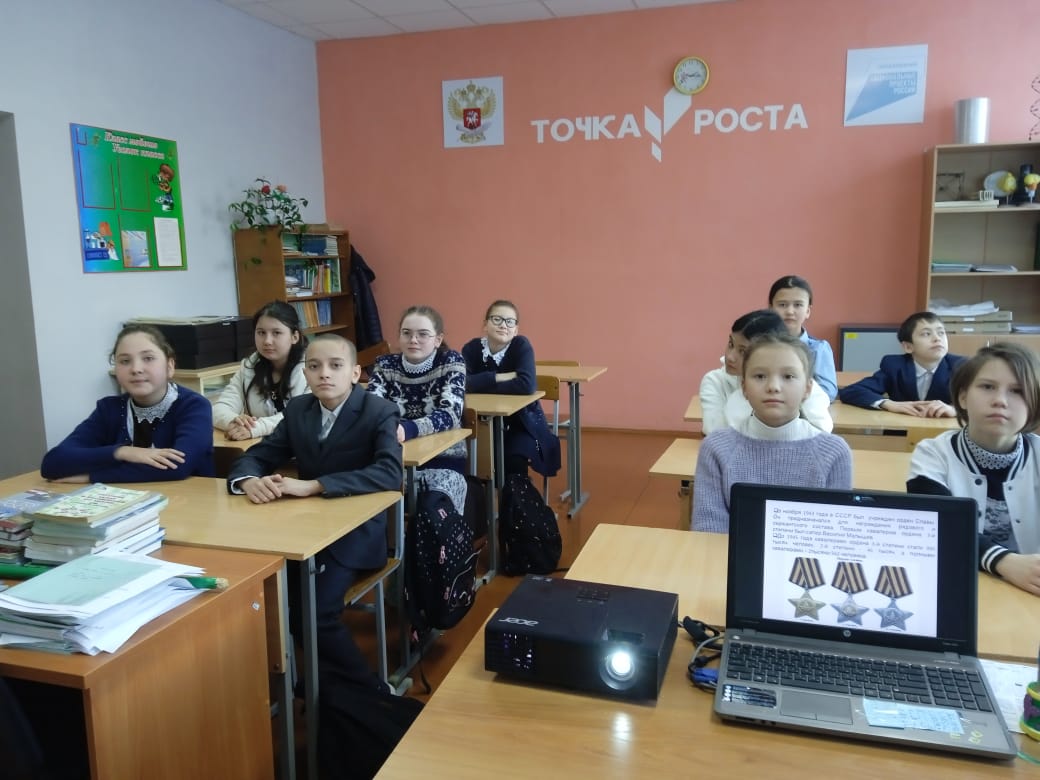 Школьникам  показали фрагменты фильмов о военном времени нашей страны и  презентацию, из которой ребята узнали об истории военных наград, о подвигах, отваге и мужестве людей.