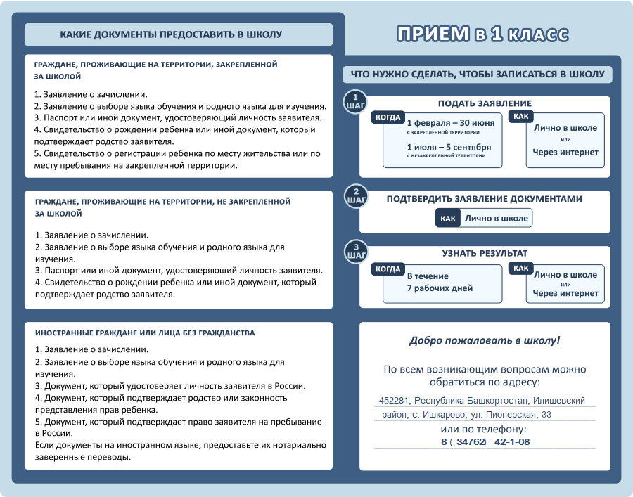 Напомним, что обучение в начальной школе начинается с момента достижения ребёнком 6 лет 6 месяцев при отсутствии противопоказаний по состоянию здоровья, но не позже 8 лет. Для обучения в более раннем или более позднем возрасте требуется письменное заявление родителей (законных представителей) и разрешение учредителя школы.