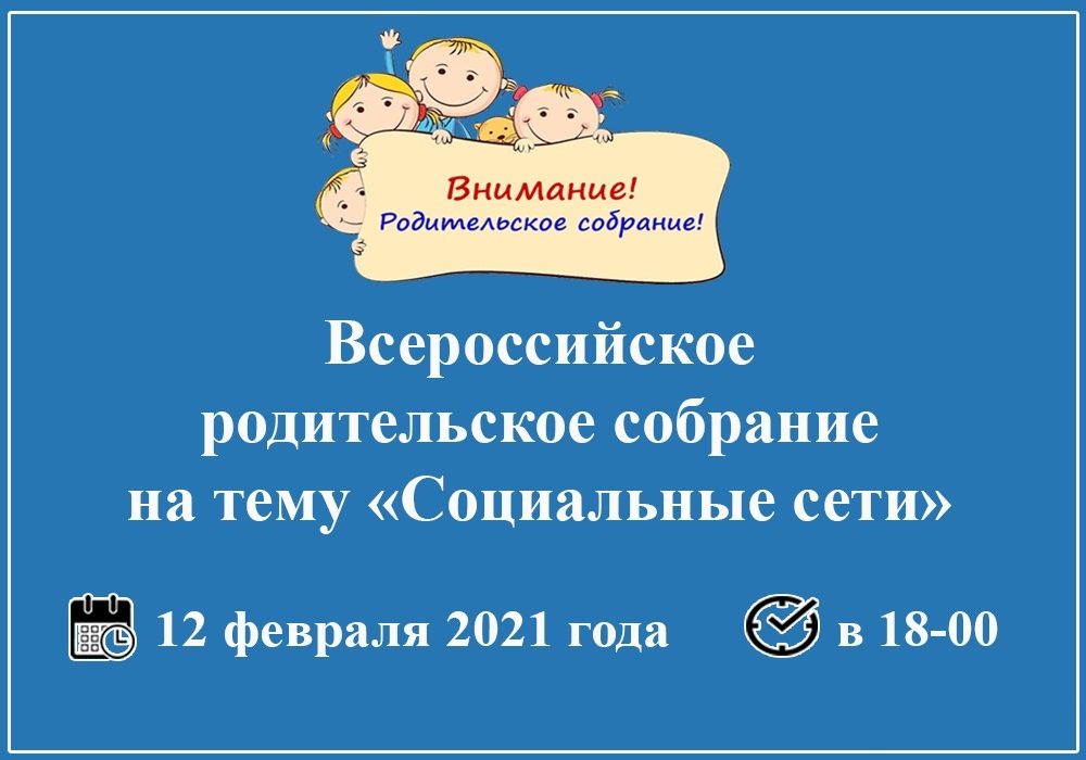 Министерство просвещения Российской Федерации информирует о проведении 12 февраля в 18.00 по московскому времени Всероссийского родительского собрания на тему "Социальные сети", в рамках которого родителей ознакомят с популярными среди детей социальными сетями, особенностями их интереса к ним.