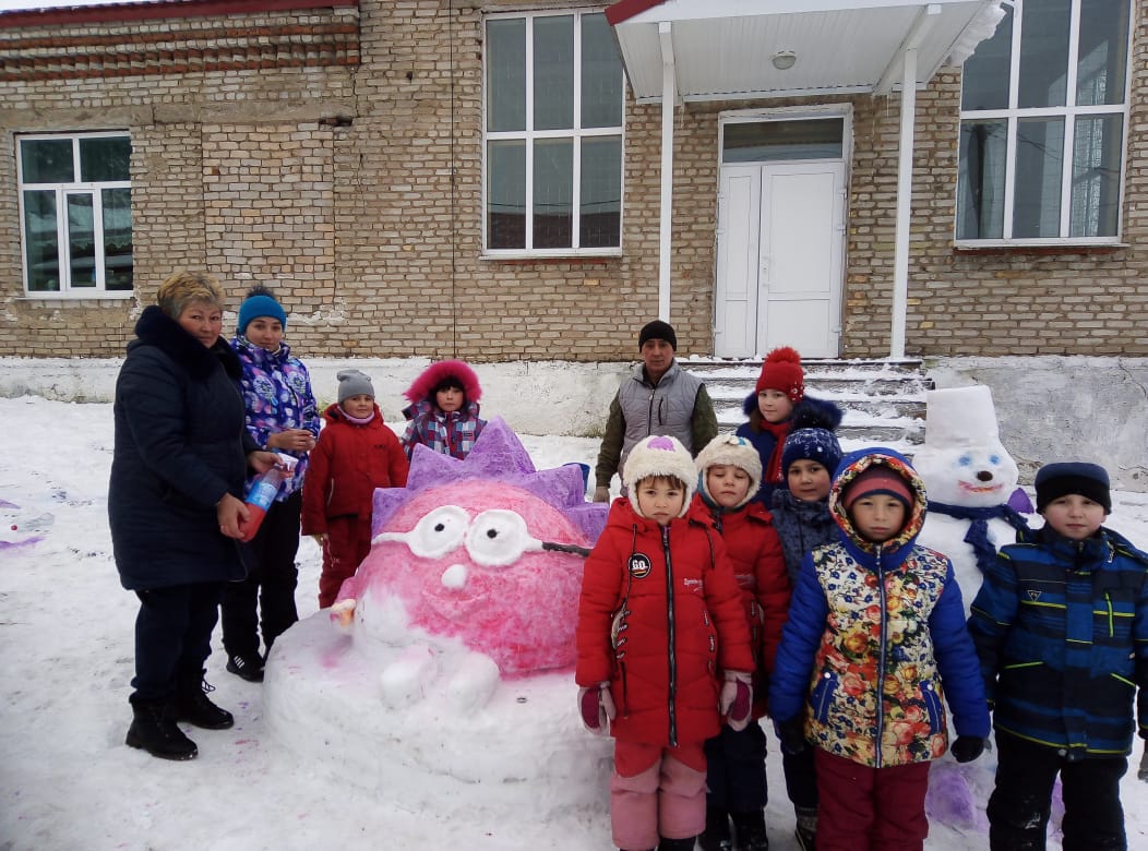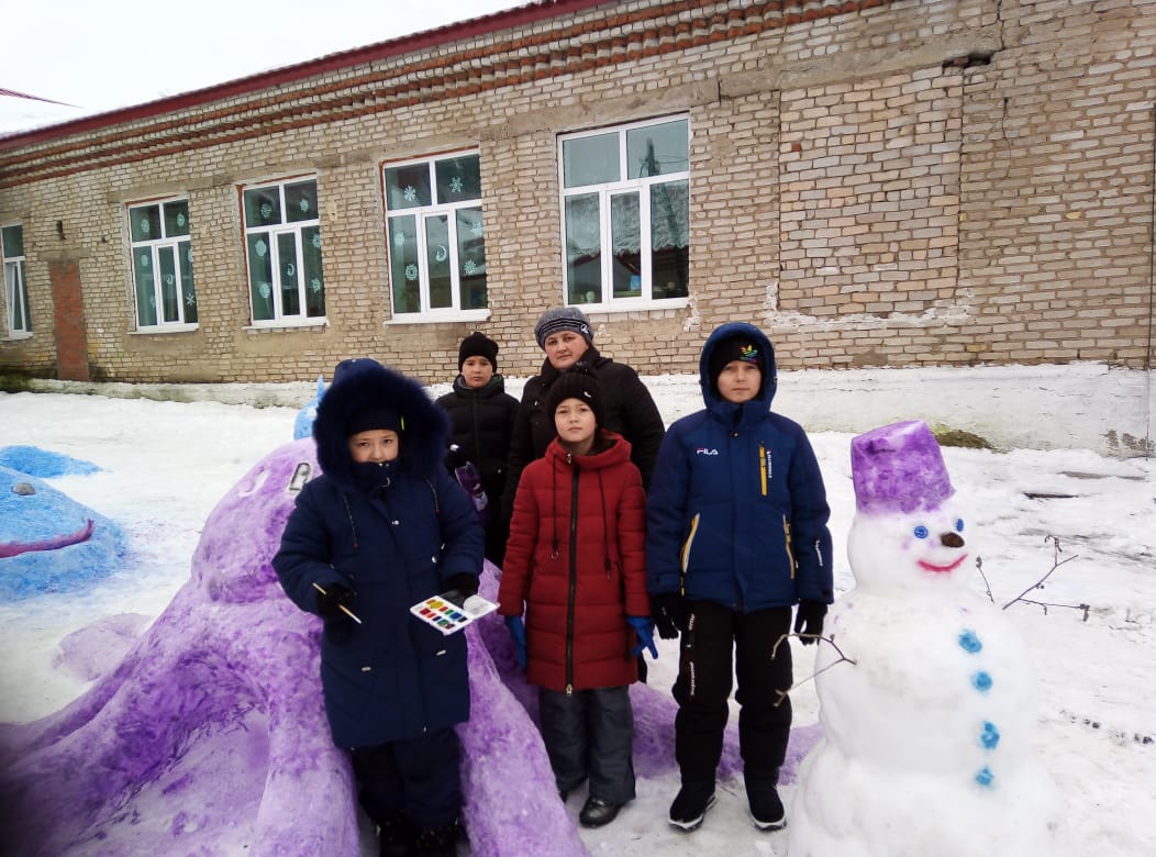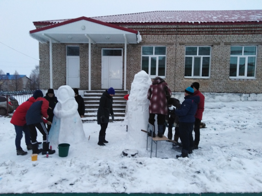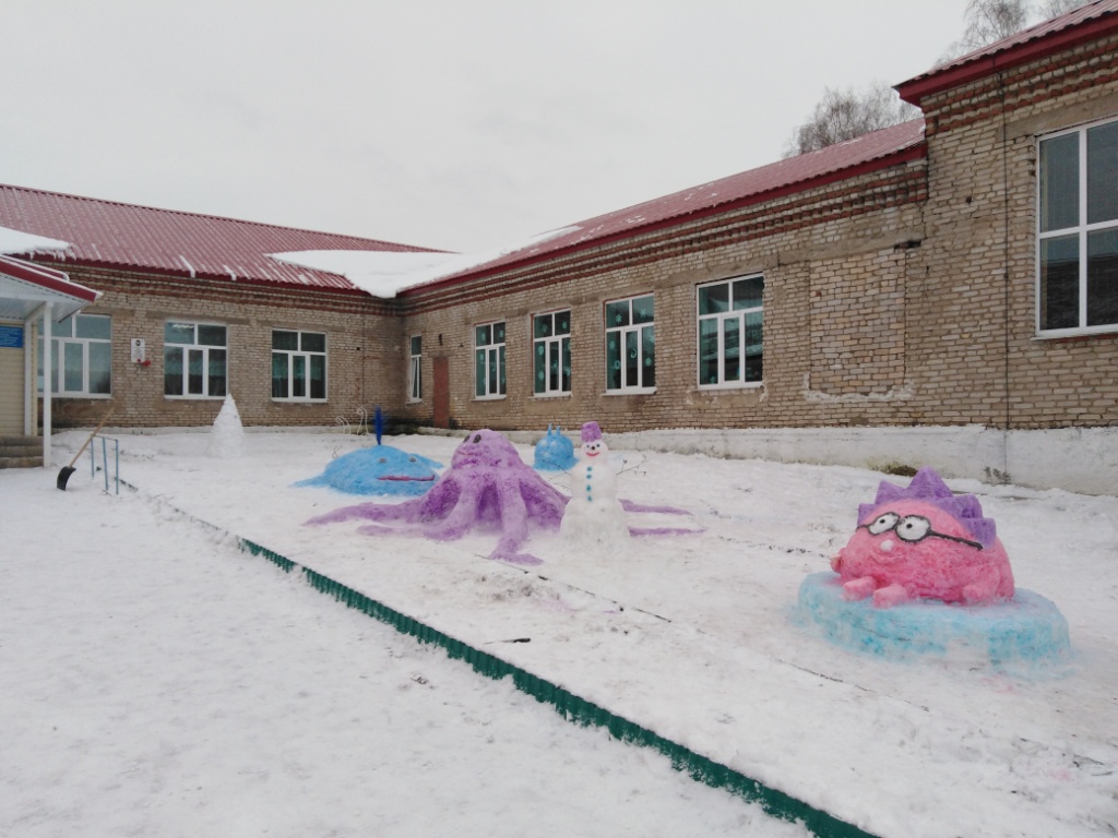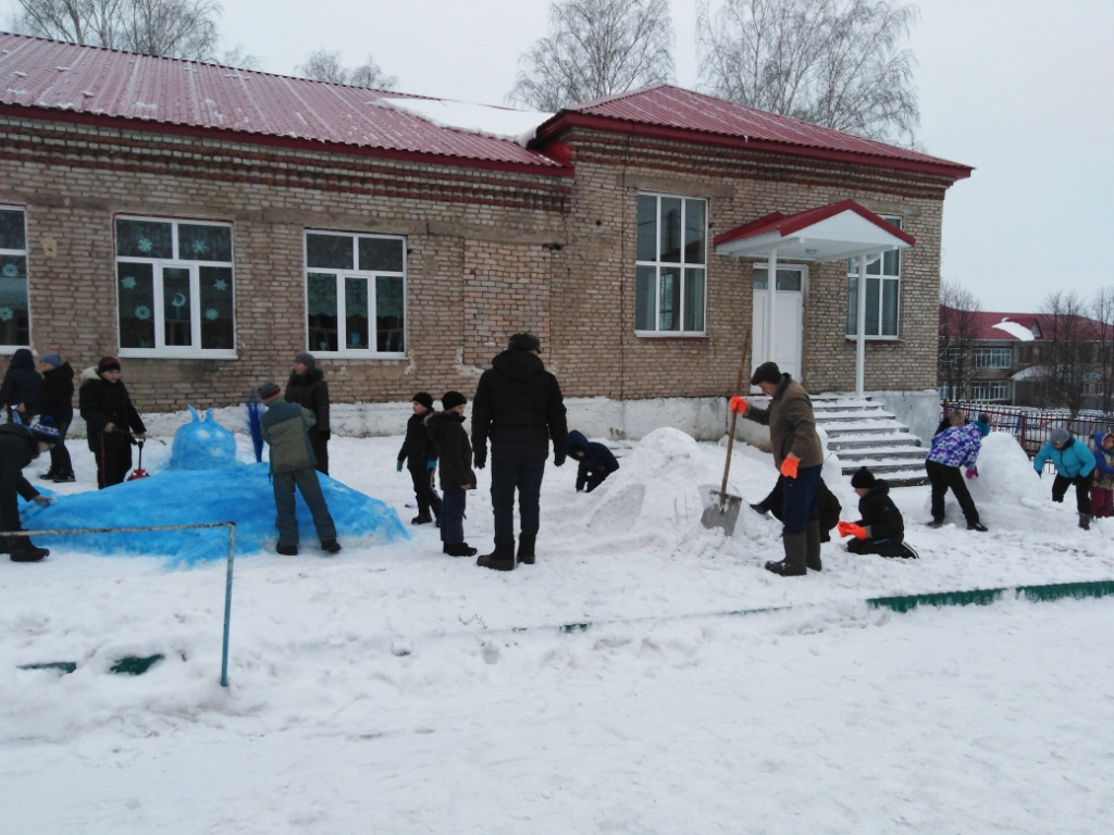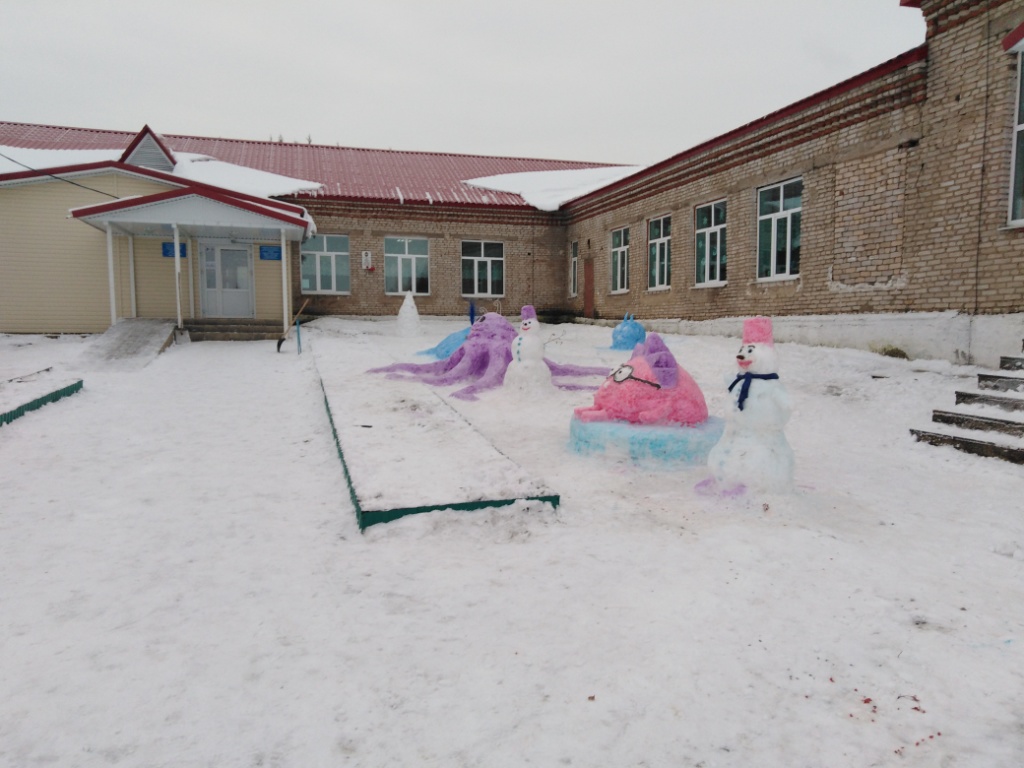 Ежегодно в канун Нового Года, по традиции, в нашей школе учащиеся вместе с родителями и классными руководителями с 1 по 11 класса участвуют в изготовлении сказочных снежных фигур. И этот год не стал исключением, благо, накануне выпал белый снег. В субботу все учащиеся и учителя взялись за дело. Не остались и в стороне родители. И вот, благодаря стараниям и фантазии всех, на школьном дворе появились фигурки морских чудовищ –кашалота и осьминога. Как будто из сказочного леса пришли озорной медведь и хитрая лиса. Не остались в стороне и мултяшные герои – смешарики. А руководителем всего этого встали фигуры Снегурочки и Деда Мороза, ведь это они главные герои новогоднего праздника.