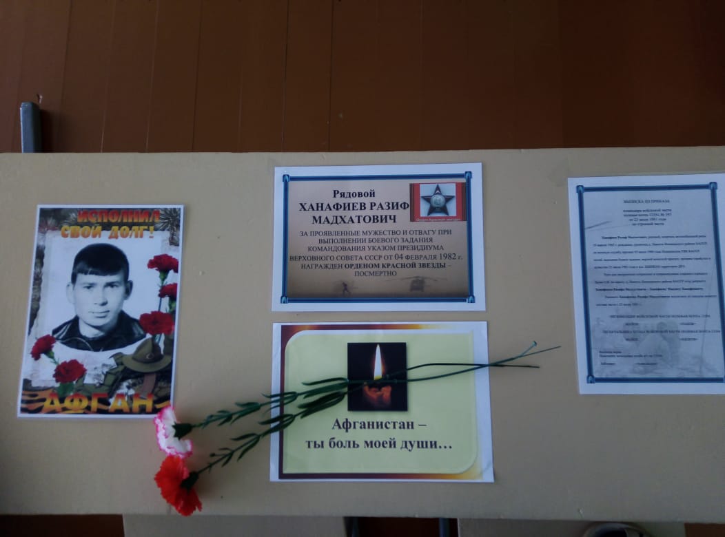 2 марта в нашей школе состоялось открытие такой парты. Она посвящена выпускнику нашей школы, нашему земляку Разифу Ханафиеву, погибшему в Демократической Республике Афганистан, выполняя свой долг. Посмертно он награжден орденом Красной Звезды. Когда учился в школе, Разиф показал себя примерным учеником, хорошо учился, занимался спортом.