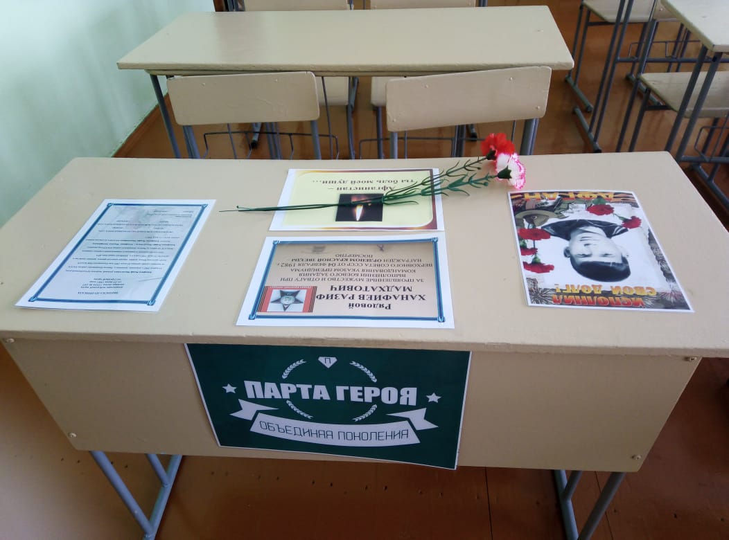 Парта Героя – ученическая парта с размещенной на ней информацией о заслуженном человеке, герое, имеющем непосредственное отношение к школе и вошедшем в историю отечества и/или являющимся героем нашего времени, его фотографией, биографией, героическим путем.