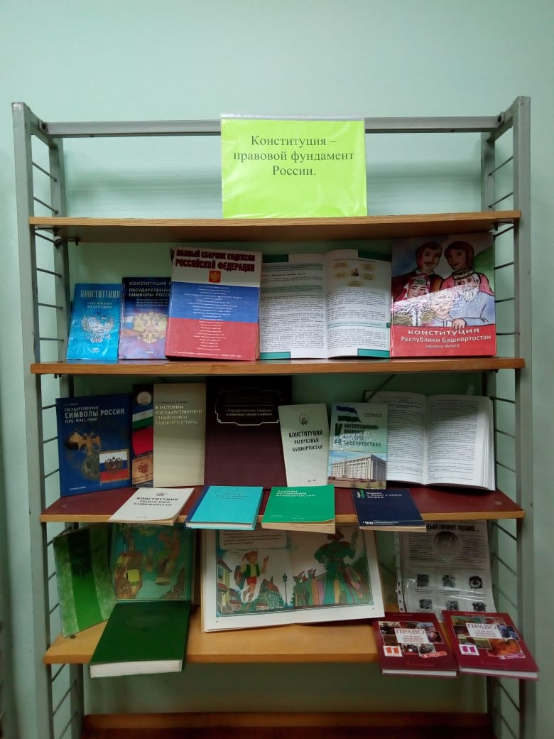 В целях решения задач гражданского, патриотического воспитания учащихся, формирования у них гордости за достижения своей страны и бережного отношения к историческому прошлому и традициям народов России, школе были проведены мероприятия, посвященные Дню Конституции. В ходе мероприятий обучающиеся познакомились с историей возникновения праздника, подвигами наших предков во имя независимости Родины. Библиотекарь школы Гусманова Р.Р. организовала книжную выставку «Конституция – правовой фундамент России».