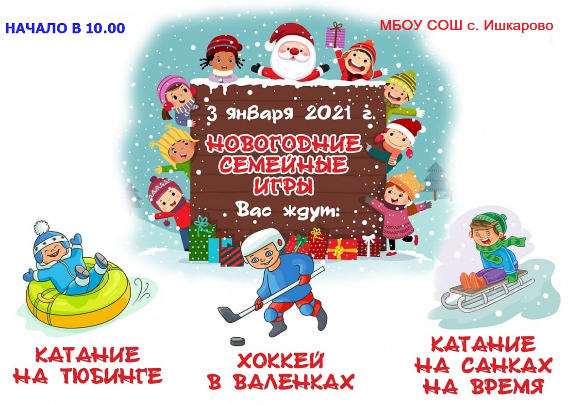 3 января в 10:00 в МБОУ СОШ с. Ишкарово состоятся Новогодние семейные игры-2021 (школьный этап) среди 1-4 классов.