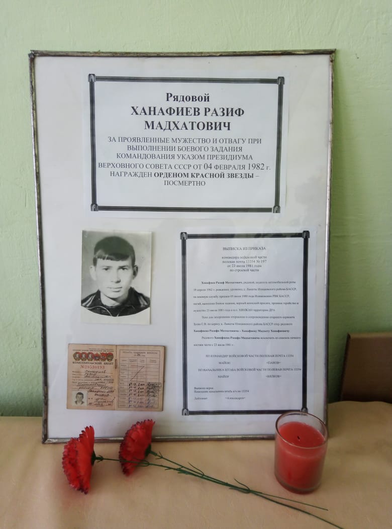 Афганистан – это боль и скорбь; это война, в которой наши ребята были просто солдатами… Эта боль коснулась и нашего села. Наш земляк Разиф Ханафиев героически погиб в Афганистане.